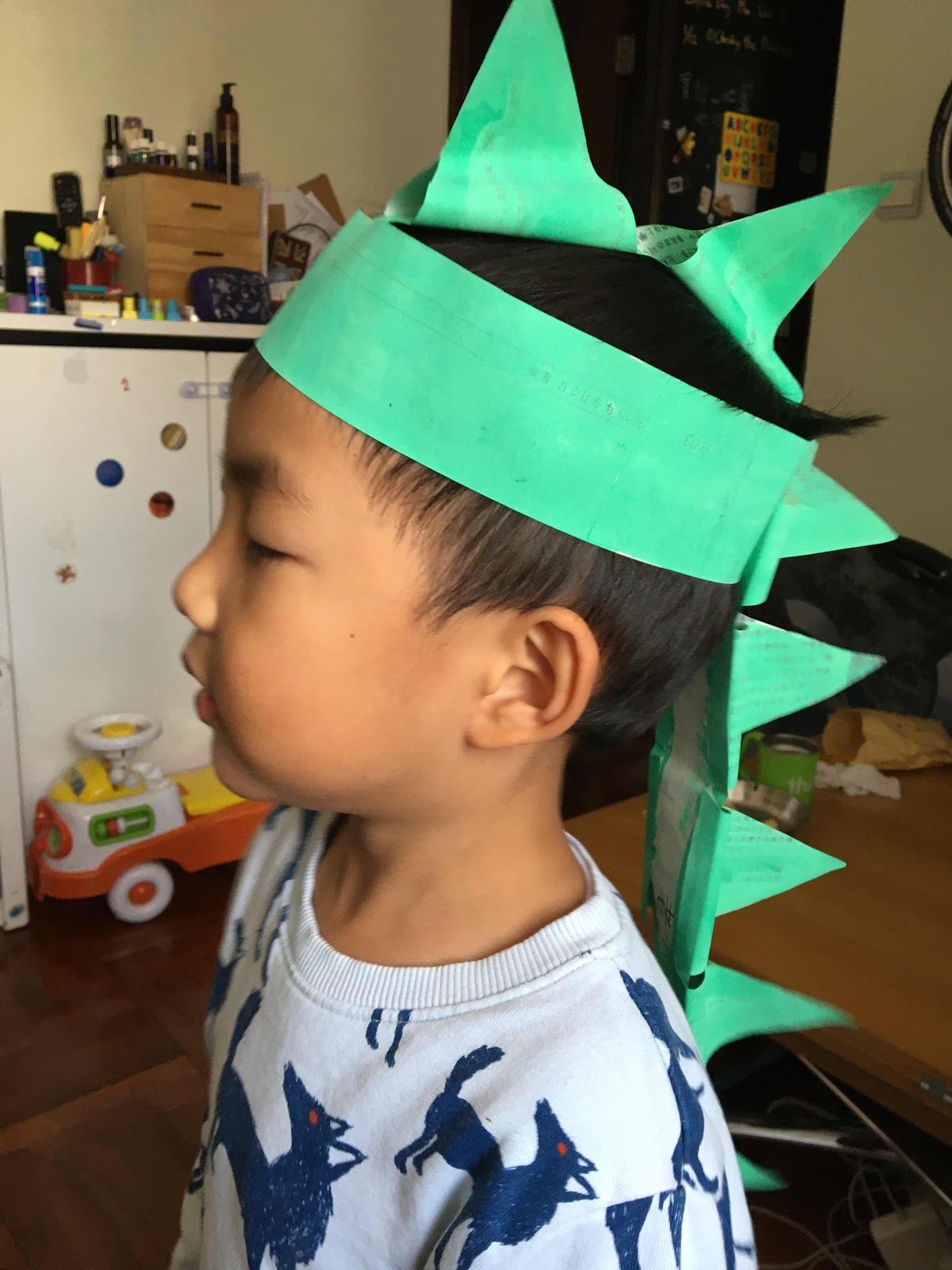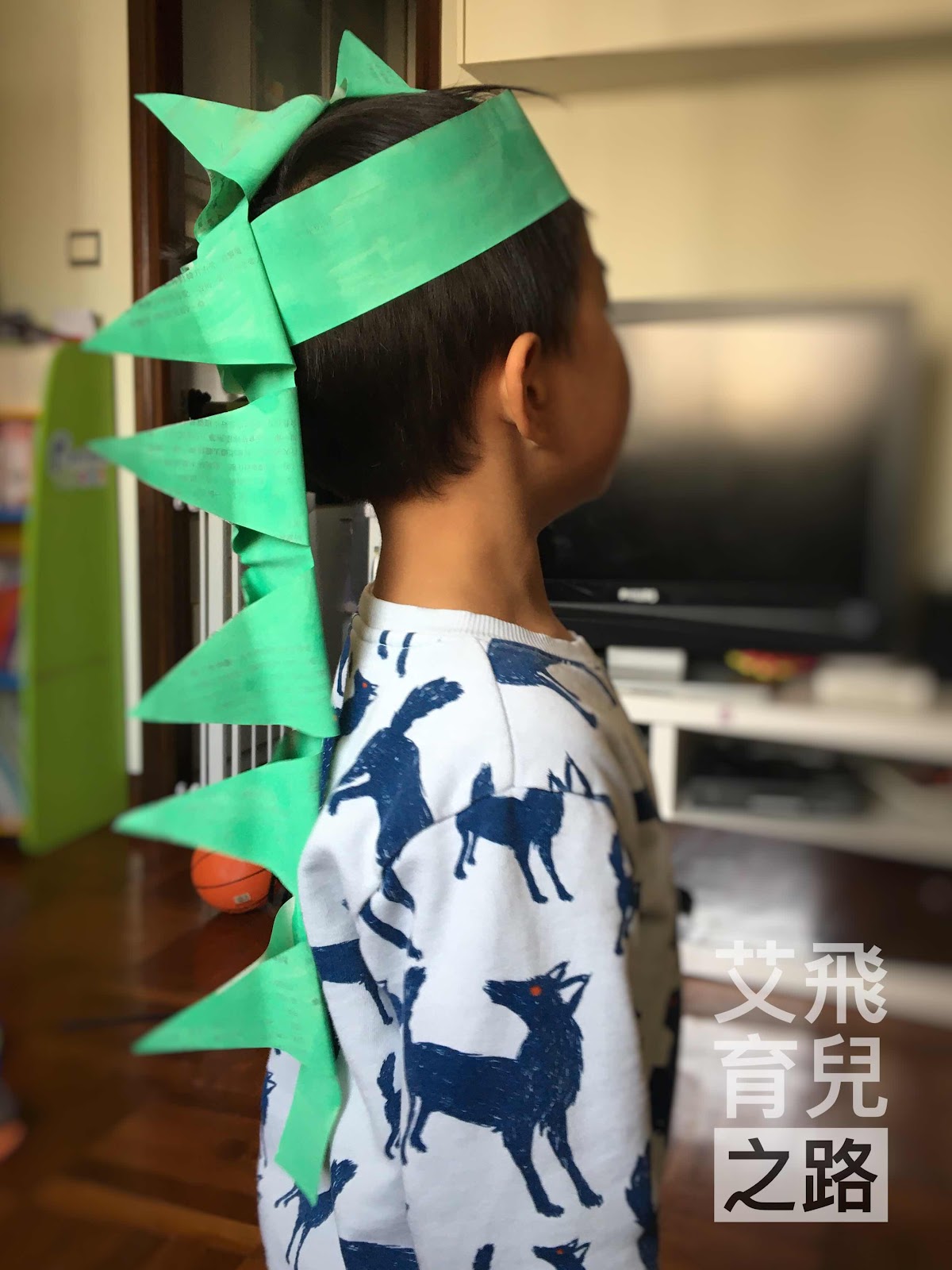 因為棋棋很喜歡恐龍,於是想到用紙造一頂恐龍帽子,快速變裝~家裡多了兩隻小恐龍🦖🦕